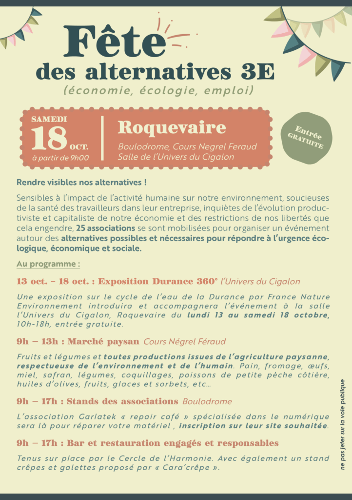 Une exposition sur le cycle de l’eau de la Durance par France Nature Environnement introduira et accompagnera l’événement du lundi 13 au samedi 18 octobre, 10h-18h, entrée gratuite. - 9h – 13h : Marché paysan