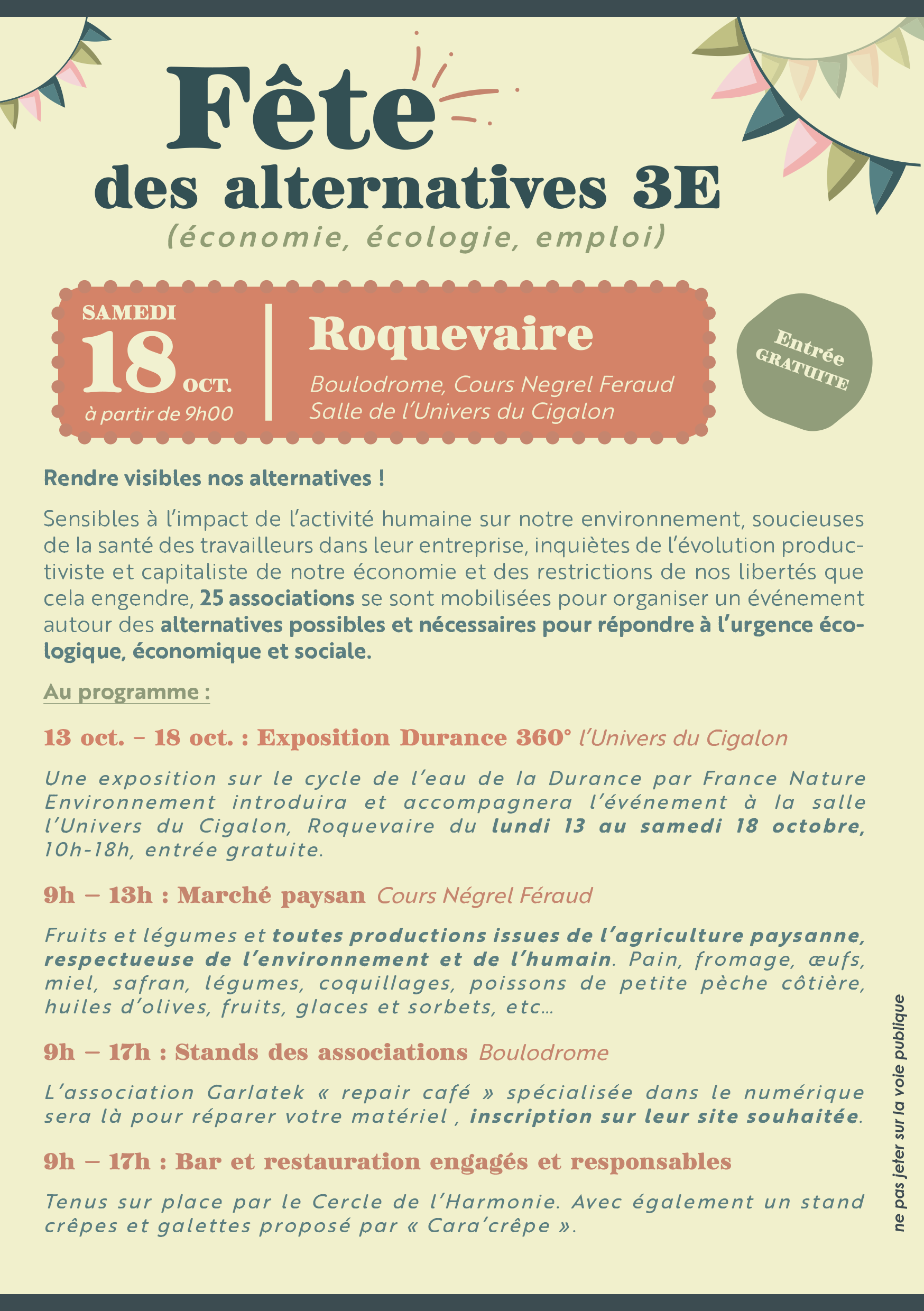 Sensibles à l’impact de l’activité humaine sur notre environnement, soucieuses de la santé des travailleurs dans leur Entreprise, inquiètes de l’évolution productiviste et capitaliste de notre économie et des restrictions de nos libertés que cela engendre, 25 associations se sont mobilisées pour organiser un événement autour des alternatives possibles et nécessaires pour répondre à l’urgence écologique, économique et sociale.